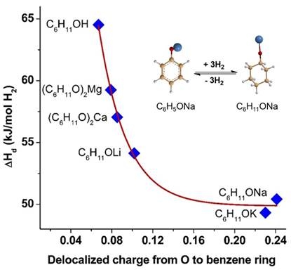 Recently, our research team proposed a new strategy: using the difference in electronegativity of metals to modify the electronic properties of organic hydrogen storage materials, and synthesized a novel organic-inorganic hybrid hydrogen storage system: metal organic compounds (MOCs). Theoretical calculation results show that the addition of metals can significantly reduce the dehydrogenation enthalpy of organic materials, and as the electron-donating properties of metals increase, the dehydrogenation enthalpy of materials decreases. In other words, by selecting different metals, the dehydrogenation enthalpy change of materials can be controllably adjusted, thereby thermodynamically controlling the dehydrogenation temperature of materials. This article takes sodium-modified phenol-cyclohexanol as an example, and its dehydrogenation enthalpy change has been reduced from 64.5 kJ/mol-H2 to 50.4 kJ/mol-H2. At the same time, it was found that as the electron-donating ability of the metal increases, the α-position C-H bond length of sodium cyclohexanol increases, and the two are in a linear relationship, which shows that the material has been activated after organic-inorganic hybridization, and the α-position C-H bond is preferentially broken during the dehydrogenation process.