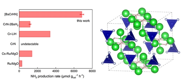 In this work, based on previous work (Angew. Chem. Int. Ed., 2015; Nat. Chem., 2017; J. Am. Chem. Soc., 2018), our group reported a new strategy for the design of ammonia synthesis catalysts, namely, preparing barium-chromium quaternary nitrogen hydride catalysts from barium and chromium amide compounds, with the catalyst active phase being Ba5CrN4H. This unique structure can give lattice nitrogen and latticehydride ion(H-) higher reactivity, and can achieve effective ammonia synthesis catalysis under mild conditions. For example, under 573 K and 10 bar conditions, the ammonia synthesis rate of this catalyst is 6.8 mmol NH3 cat-1h-1, which is more than 3 orders of magnitude higher than that of chromium nitride catalysts and about 4 times that of Cs-Ru/MgO catalysts. This research work further enriches the understanding of "the role of hydrides in ammonia synthesis catalysis", and also provides new ideas for the development of new ammonia synthesis catalysts, especially for the design of pre-transition metal catalysts that are generally considered to have low activity.