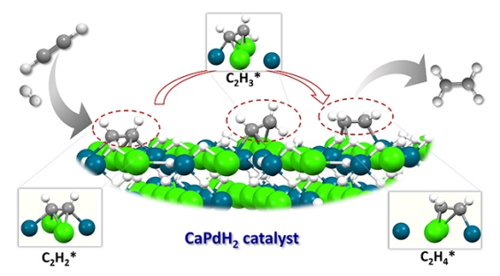 The selective hydrogenation of alkynes to olefins plays an important role in the fields of petrochemicals, synthetic drugs, fine chemicals, etc. The development of efficient catalysts is the key to realizing this process. In this work, the collaborative team proposed a different catalyst design strategy, using coordinated metal hydrides (CaPdH2) for the selective hydrogenation of alkynes. The catalyst regulates the adsorption and hydrogenation energy barriers of alkynes, olefins and reaction intermediates through the synergistic effect of [PdH2]δ- and Caδ+, thereby achieving highly selective hydrogenation of alkynes to olefins. As a unique class of catalysts, this type of ternary hydride catalyst is significantly different from conventional heterogeneous alkyne selective hydrogenation catalysts in terms of active center composition, structure, reaction kinetic properties, and catalytic mechanism. This work enriches the alkyne selective hydrogenation catalyst system, and based on the diversity of the composition and structure of metal coordinated hydride materials, it provides more possibilities for finding more efficient alkyne selective hydrogenation catalysts.
