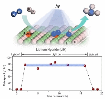 Based on previous studies (Nat. Chem., 2017; Nat. Energy, 2018; Nat. Catal., 2021), this study explores the nitrogen fixation behaviour of hydrides under light. The research team found that LiH, as an inorganic wide bandgap semiconductor, dehydrogenates and changes colour under ultraviolet light. Unlike conventional oxide or nitride semiconductors, after LiH produces carrier separation, hydride ions (H-) lose electrons to form H2 and generate hydrogen vacancies. Meanwhile, photogenerated electrons can create electron-rich colour central structures at the surface hydrogen vacancies, facilitating the reduction and activation of nitrogen. In this process, hydride ions also participate in the formation of NH bonds. Under conditions of nitrogen and hydrogen co-feeding, the research team achieved the LiH-mediated photocatalytic synthesis of ammonia under mild conditions. This work demonstrates the development potential of hydrides in mediating photochemical reactions and enriches the knowledge system of hydride-based nitrogen fixation chemistry.
